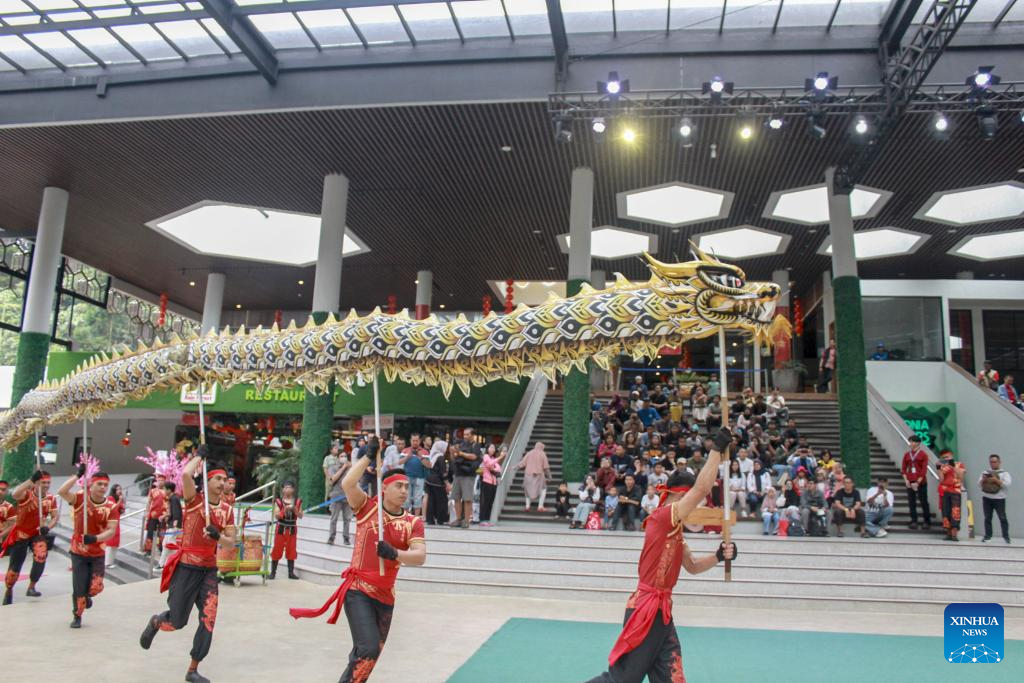 People perform the dragon dance during a Chinese Lunar New Year celebration at Taman Safari zoo in Bogor, West Java, Indonesia, on Feb. 9, 2024. (Photo by Sandika Fadilah/Xinhua)