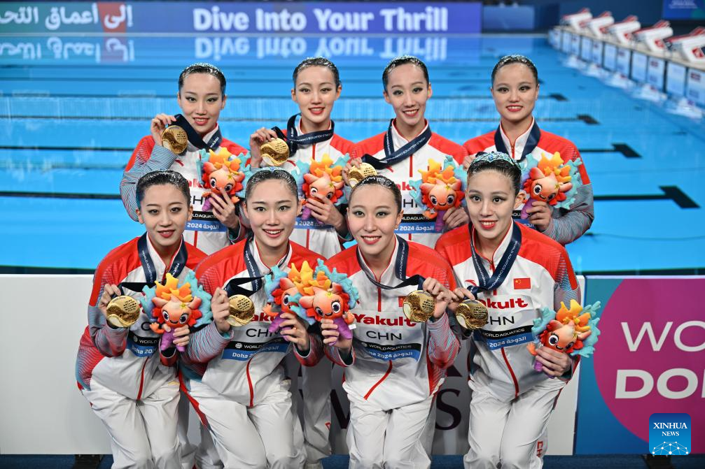 Team China pose after the awarding ceremony for team free of artistic swimming at the World Aquatics Championships in Doha, Qatar, Feb. 9, 2024. (Xinhua/Xue Yuge)