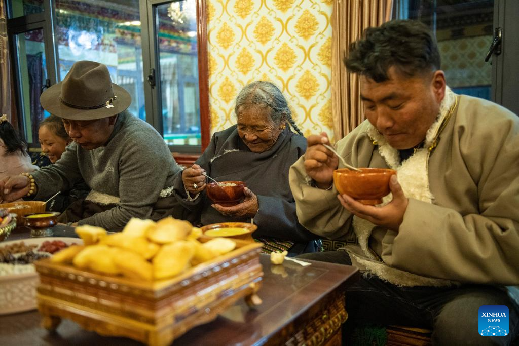 Sichod Wangmo (2nd R) and her family have "gutu" at home in Damxung County, southwest China's Xizang Autonomous Region, Feb. 8, 2024.