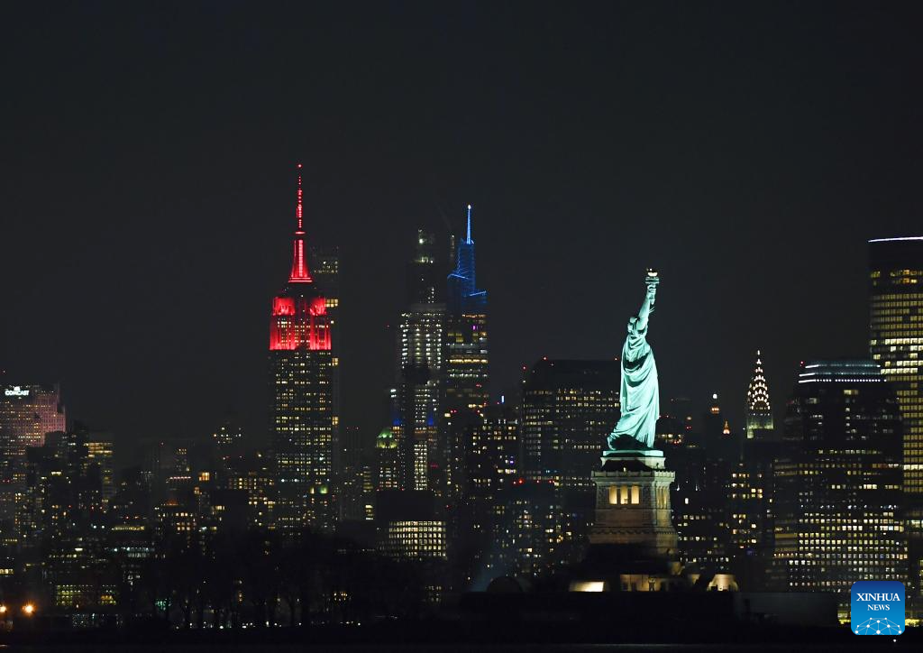This photo taken on Feb. 8, 2024 shows the Empire State Building lit up in red for the Chinese Lunar New Year in New York, the United States. (Xinhua/Li Rui)