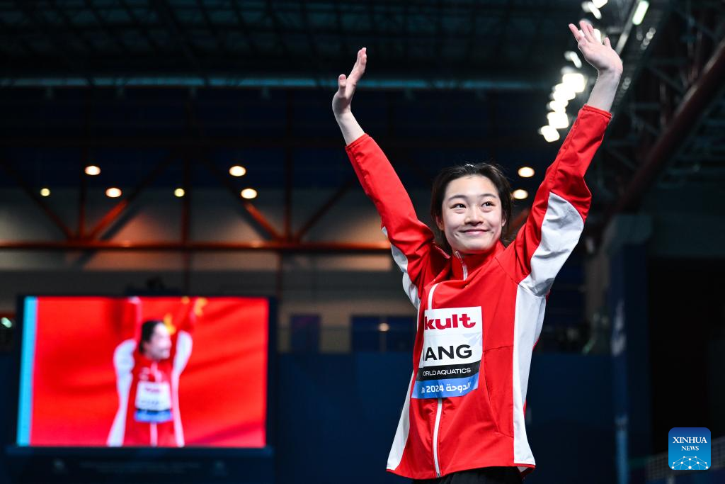 Chang Yani of China celebrates during the awarding ceremony for the women's 3m springboard final of the World Aquatics Championships 2024 in Doha, Qatar on Feb. 9, 2024. (Xinhua/Du Yu)