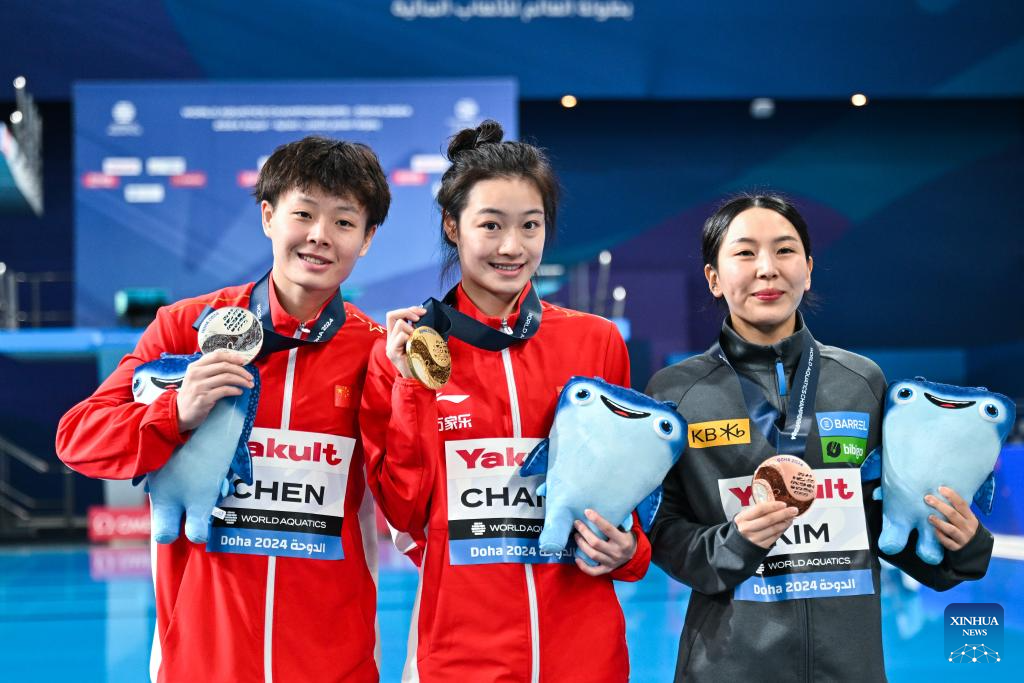 Gold medalist Chang Yani (C) of China, silver medalist Chen Yiwen (L) of China, bronze medalist Kim Suji of South Korea pose for photos during the awarding ceremony for the women's 3m springboard final of the World Aquatics Championships 2024 in Doha, Qatar on Feb. 9, 2024. (Xinhua/Du Yu)