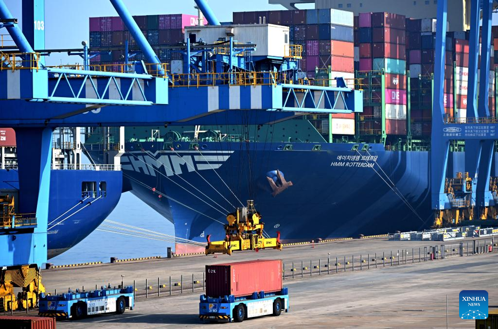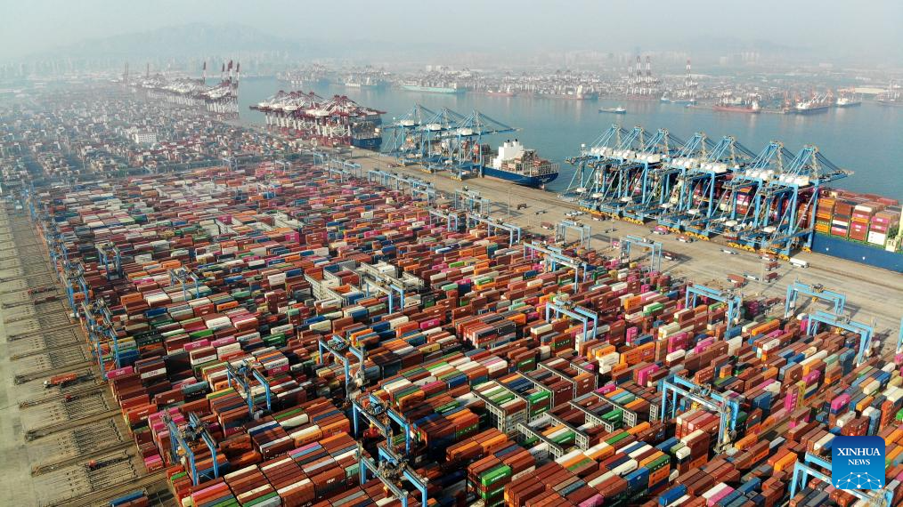 An aerial drone photo shows the Qingdao Port in east China's Shandong Province, Feb. 11, 2024. The Qingdao port is busy handling goods for export during the Spring Festival holiday. (Xinhua/Li Ziheng)