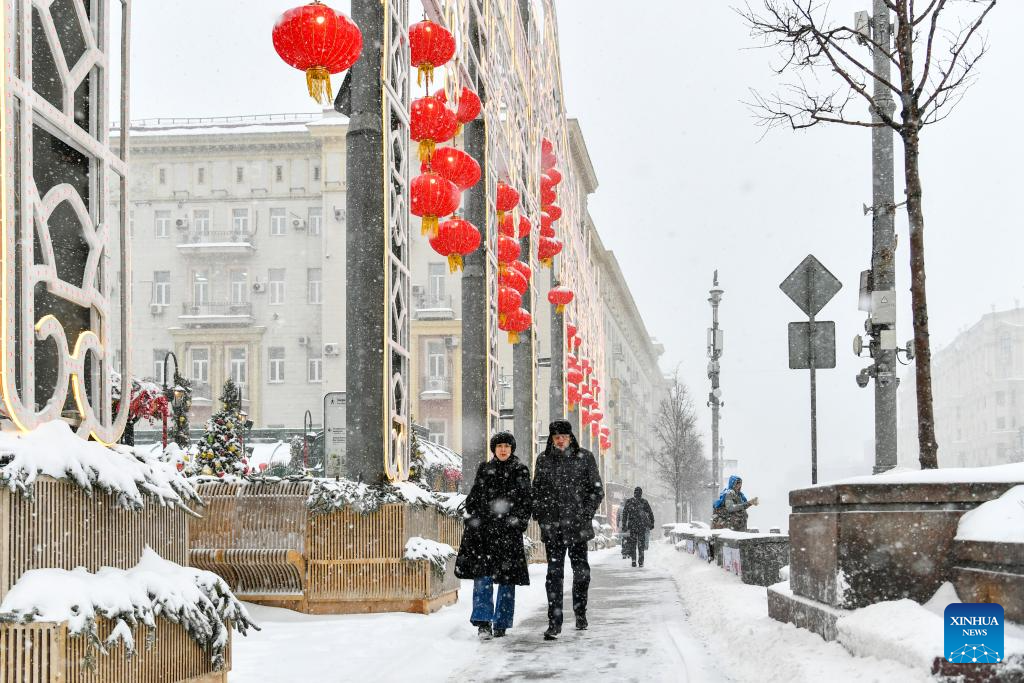 People walk on a street amid snowfall in Moscow, Russia, Feb. 15, 2024. A heavy snow hit Moscow on Thursday. (Xinhua/Cao Yang)