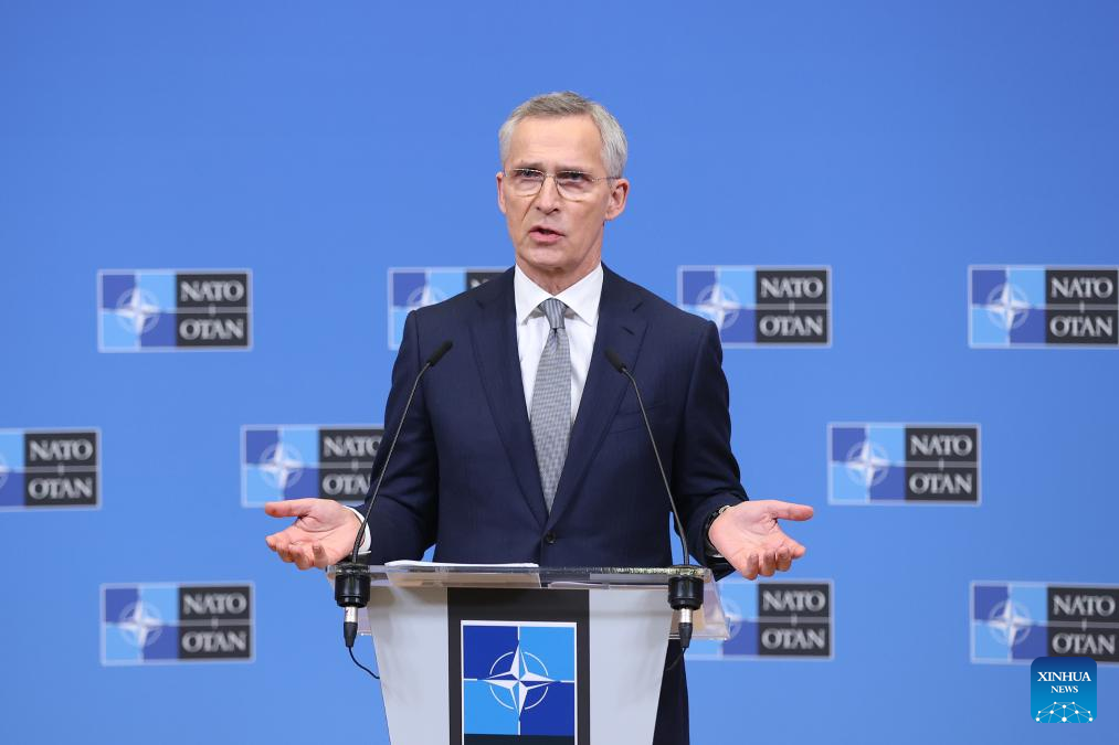 NATO Secretary General Jens Stoltenberg attends a press conference during a meeting of NATO defense ministers at the NATO headquarters in Brussels, Belgium, on Feb. 15, 2024. The North Atlantic Treaty Organization (NATO) sought to further strengthen the bloc's deterrence and defence, and support to Ukraine, at its defence ministers meeting here on Thursday. (Xinhua/Zhao Dingzhe)