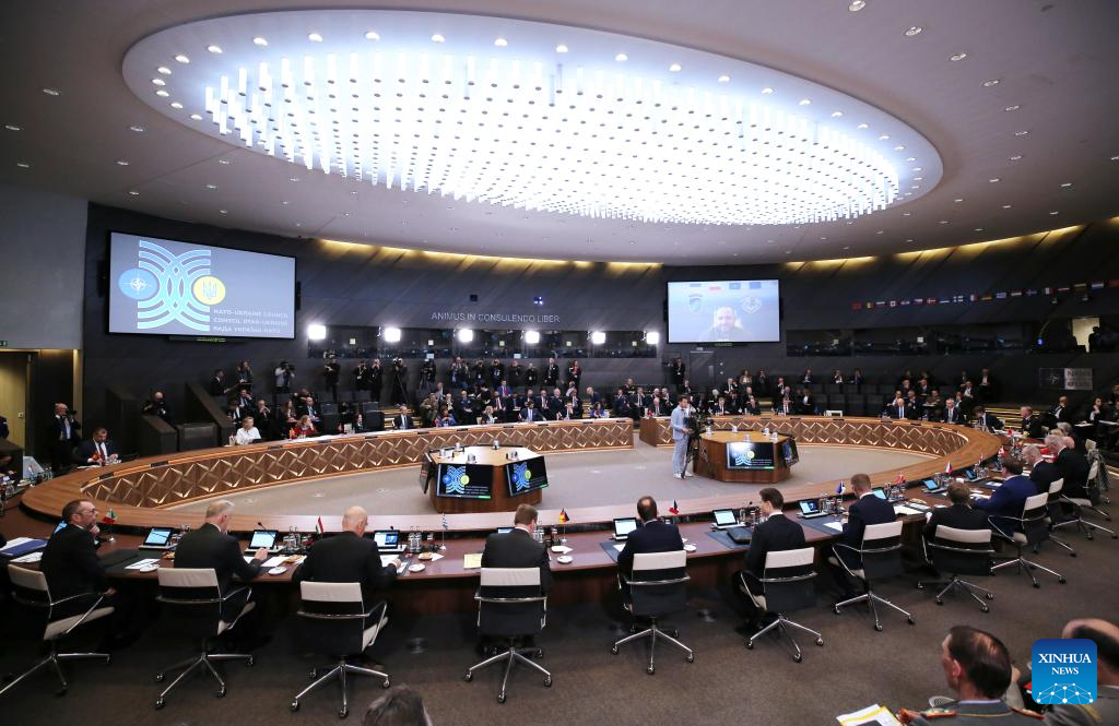 A meeting of NATO defense ministers is held at the NATO headquarters in Brussels, Belgium, on Feb. 15, 2024. The North Atlantic Treaty Organization (NATO) sought to further strengthen the bloc's deterrence and defence, and support to Ukraine, at its defence ministers meeting here on Thursday. (Xinhua/Zhao Dingzhe)