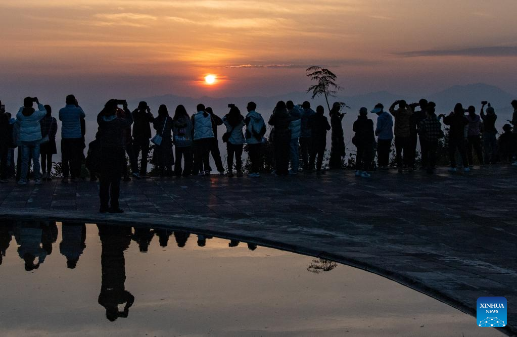 Tourists watch sunrise on the Jingmai Mountain in Lancang Lahu Autonomous County, southwest China's Yunnan Province, Feb. 14, 2024. More Chinese people nowadays choose to go on a journey during the Spring Festival to experience different cultures and lunar new year atmosphere. (Xinhua/Jiang Wenyao)