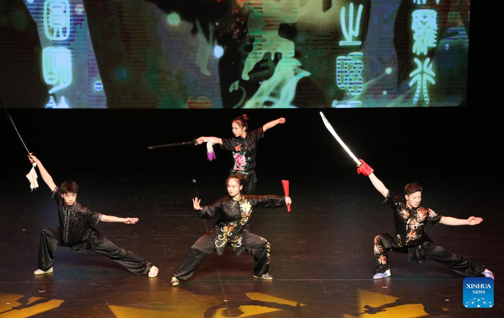 Actors perform Chinese martial arts during the "Festival of Spring" Chinese Lunar New Year Gala Night in Wellington, New Zealand, Feb. 15, 2024. The "Festival of Spring" is a national cultural brand hosted by the Overseas Chinese Affairs Office of China's State Council, and the All-China Federation of Returned Overseas Chinese, a Chinese civic organization. (Photo by Meng Tao/Xinhua)