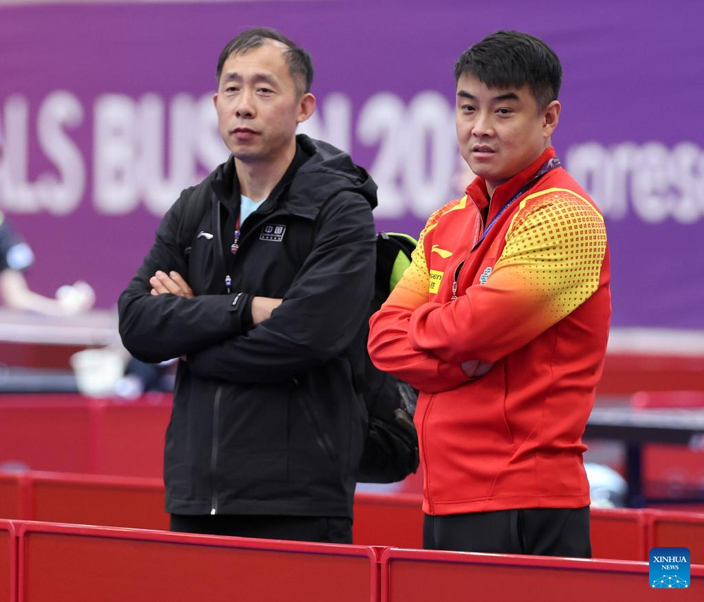 Wang Hao (R), head coach of men's squad of Team China is seen during a training session ahead of the ITTF World Team Table Tennis Championships Finals 2024 in Busan, South Korea, Feb. 15, 2024. The event will be staged here from Feb. 16 to 25. (Xinhua/Yao Qilin)