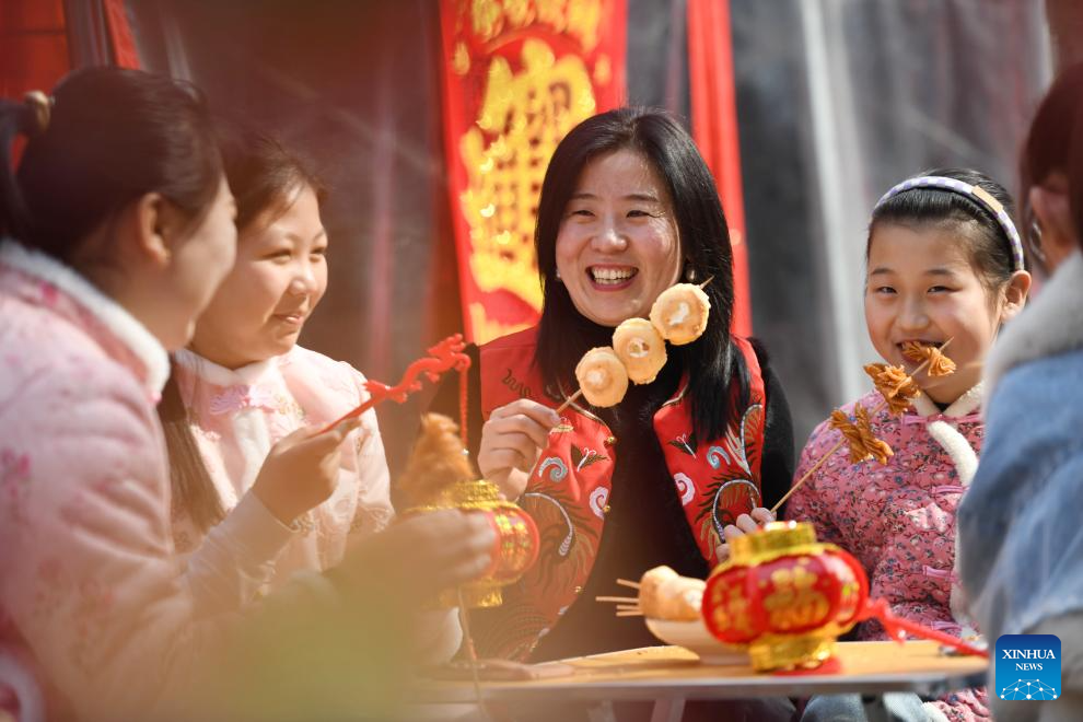 Tourists taste snacks on a food street in Tancheng County of Linyi City, east China's Shandong Province, Feb. 14, 2024. People across the country immersed themselves in the festive atmosphere of the Chinese New Year by enjoying traditional food and local snacks. (Photo by Fang Dehua/Xinhua)