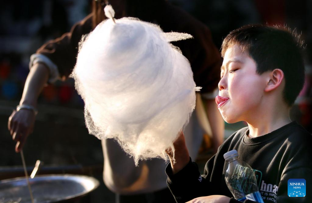 A boy eats cotton candy on a street in Shunde District of Foshan, south China's Guangdong Province, Feb. 12, 2024. People across the country immersed themselves in the festive atmosphere of the Chinese New Year by enjoying traditional food and local snacks. (Photo by Huang Jiming/Xinhua)