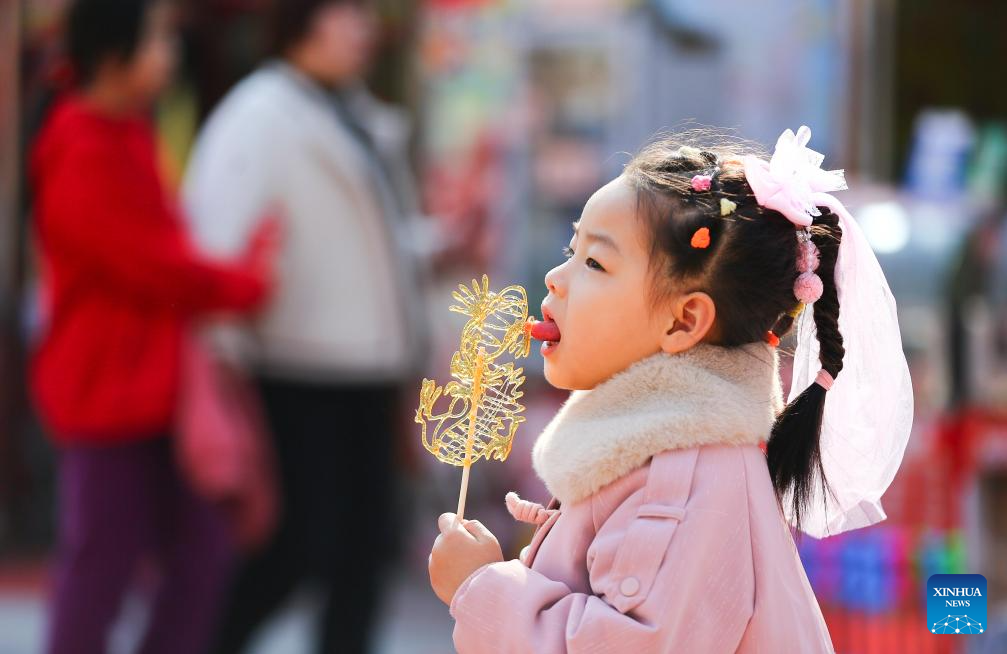 A girl tastes a sugar painting at a park in Tengzhou City, east China's Shandong Province, Feb. 13, 2024. People across the country immersed themselves in the festive atmosphere of the Chinese New Year by enjoying traditional food and local snacks. (Photo by Li Zhijun/Xinhua)