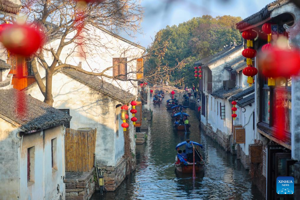 Tourists visit the ancient town of Zhouzhuang in Kunshan, east China's Jiangsu Province, Feb. 14, 2024. People across China are enjoying the ongoing Spring Festival holiday in various ways. (Photo by Qi Liguang/Xinhua)
