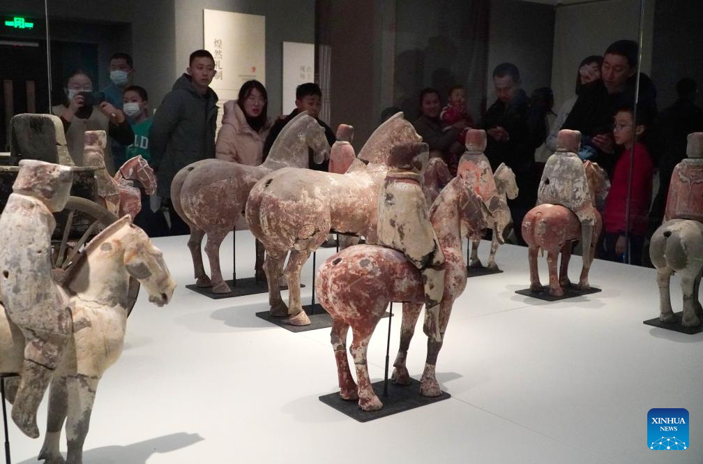 Visitors watch exhibits at the Qingzhou Museum in Qingzhou, east China's Shandong Province, Feb. 14, 2024. More Chinese people nowadays choose to go on a journey during the Spring Festival to experience different cultures and lunar new year atmosphere. (Xinhua/Xu Suhui)