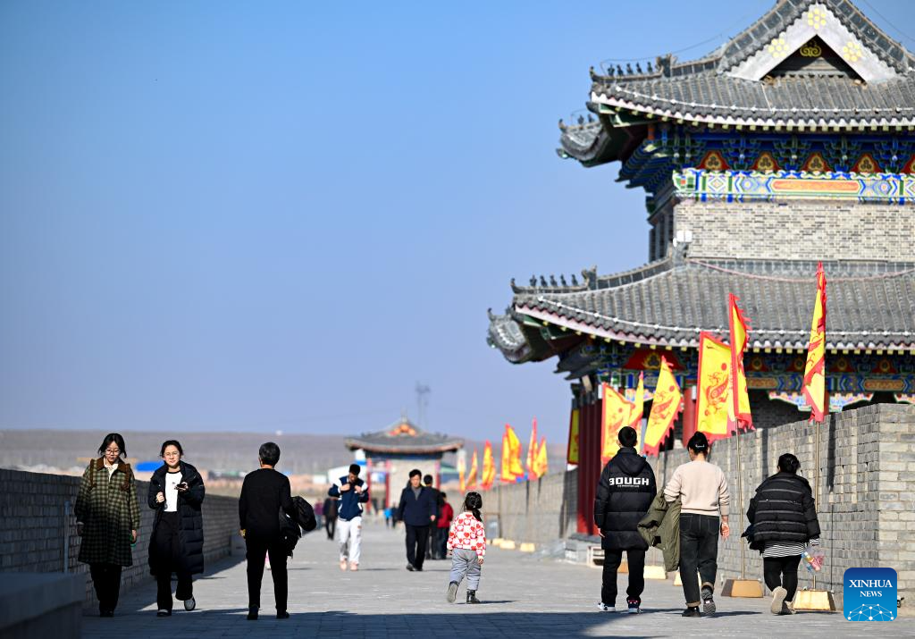 People walk on the city wall in Yanchi County, northwest China's Ningxia Hui Autonomous Region, Feb. 13, 2024. More Chinese people nowadays choose to go on a journey during the Spring Festival to experience different cultures and lunar new year atmosphere. (Xinhua/Feng Kaihua)
