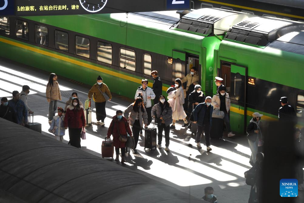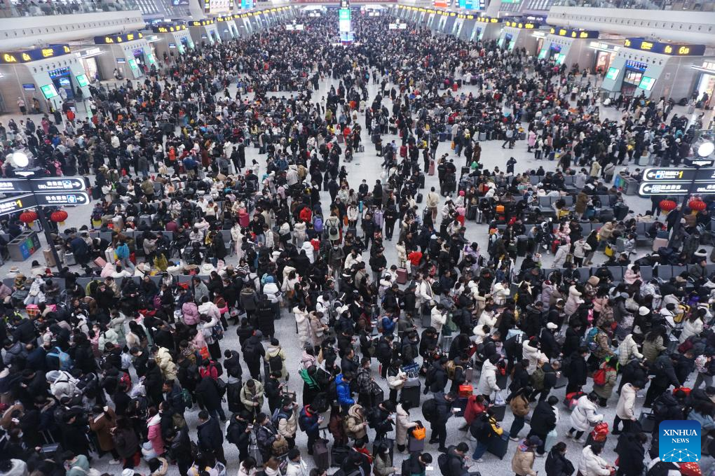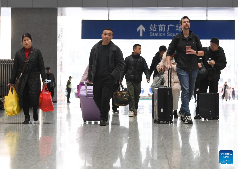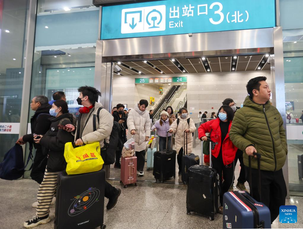 Travelers arrive at Nanjing Railway Station in Nanjing, east China's Jiangsu Province, Feb. 16, 2024. China witnessed an increase of passenger trips as this year's Spring Festival holiday is coming to an end. (Photo by Yang Suping/Xinhua)