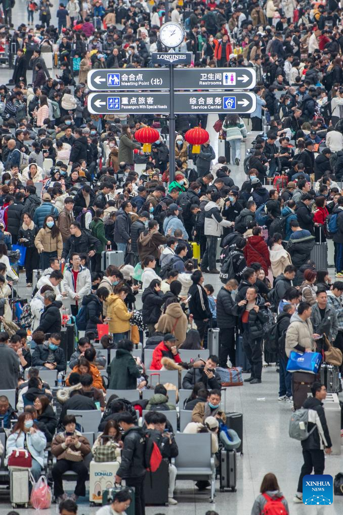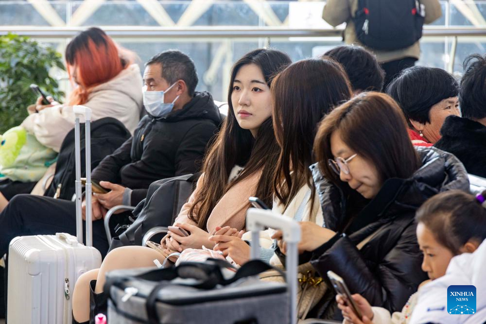 Passengers are pictured at the waiting hall of Zhengzhou East Railway Station in Zhengzhou, central China's Henan Province, Feb. 17, 2024. China witnessed an increase of passenger trips on the last day of the eight-day Spring Festival holiday. (Xinhua/Li An)