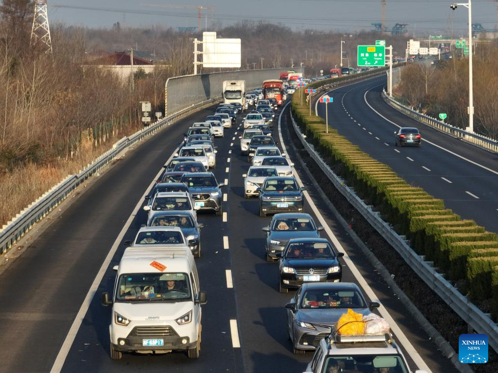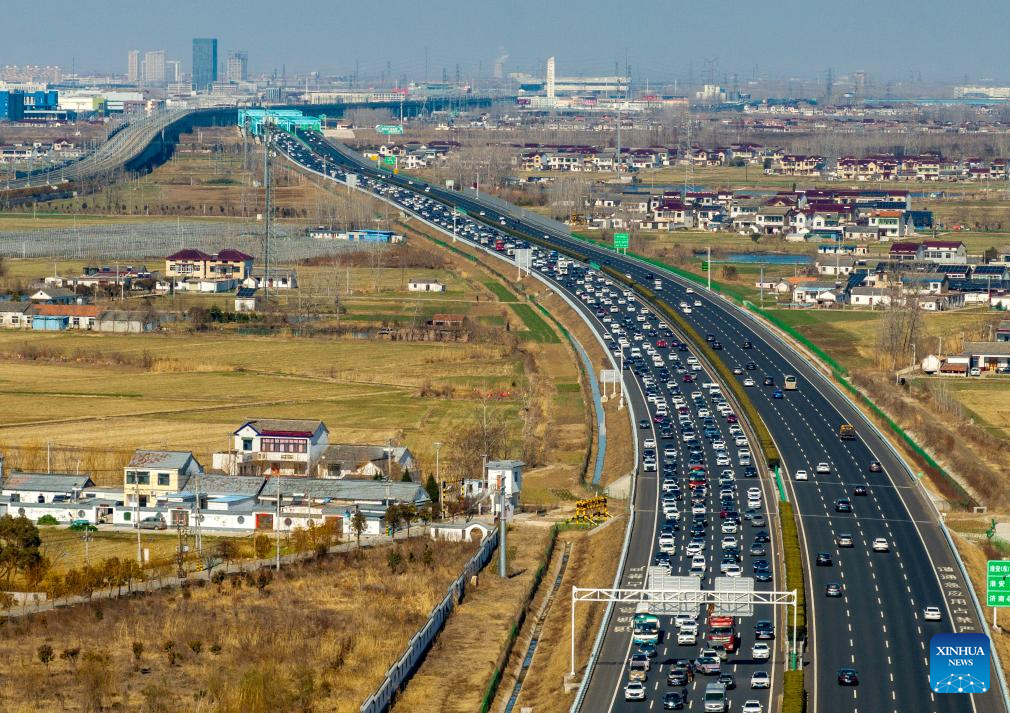 An aerial drone photo taken on Feb. 17, 2024 shows vehicles moving slowly on an expressway in Yangzhou, east China's Jiangsu Province. China witnessed an increase of passenger trips on the last day of the eight-day Spring Festival holiday. (Photo by Meng Delong/Xinhua)