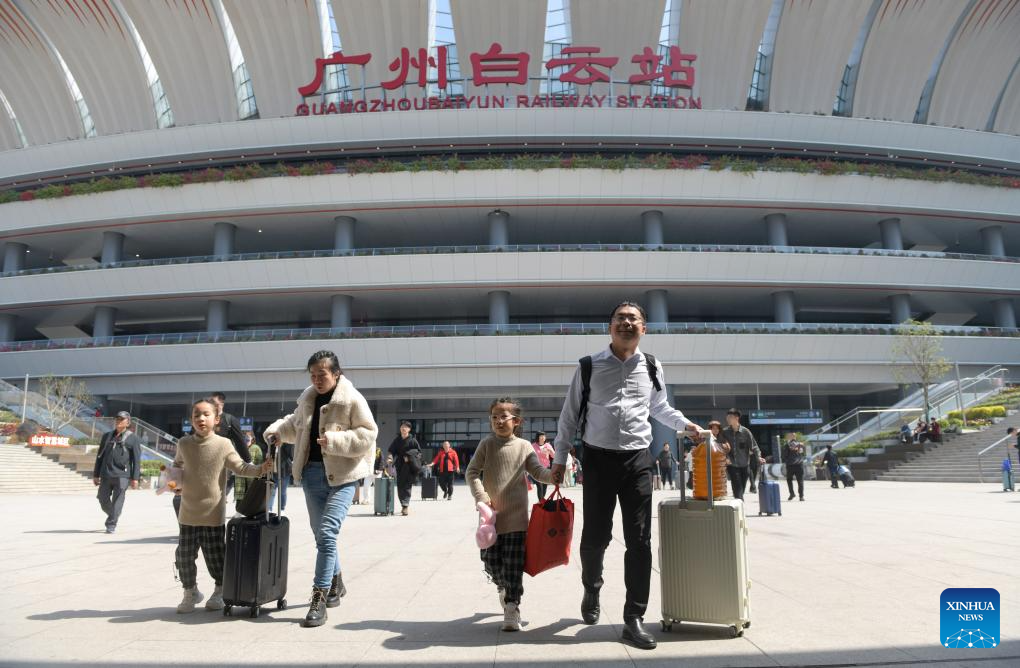 Passengers walk out Guangzhou Baiyun Railway Station in Guangzhou, south China's Guangdong Province, Feb. 17, 2024. China witnessed an increase of passenger trips on the last day of the eight-day Spring Festival holiday. (Xinhua/Lu Hanxin)