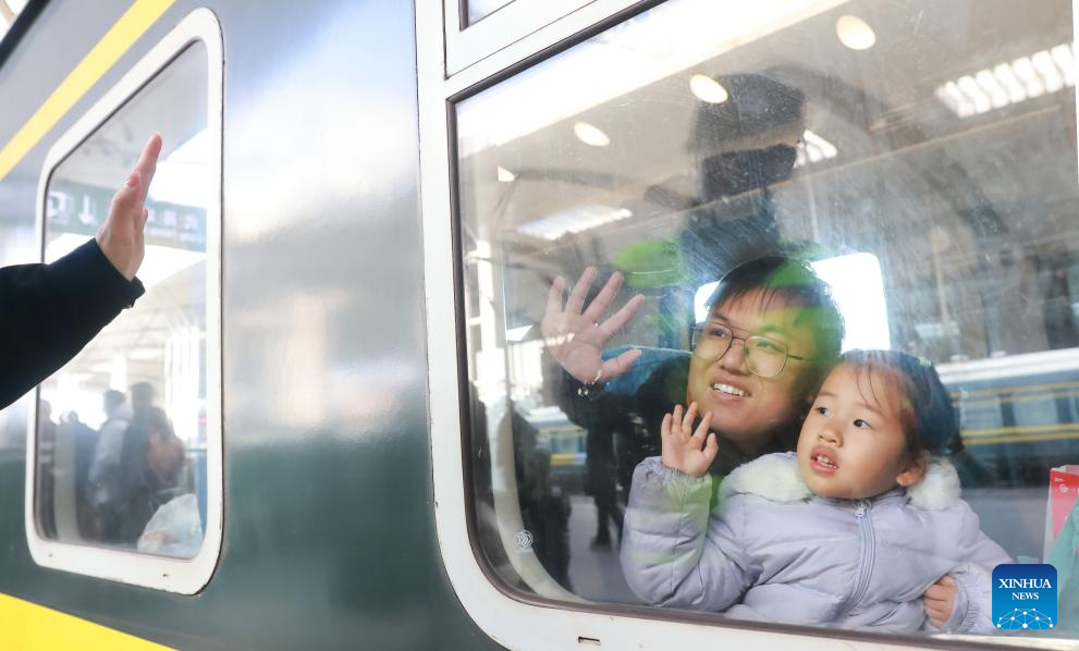 Travelers wave goodbye after boarding a train at Wuchang Railway Station in Wuhan, central China's Hubei Province, Feb. 16, 2024. China witnessed an increase of passenger trips as this year's Spring Festival holiday is coming to an end. (Photo by Zhao Jun/Xinhua)