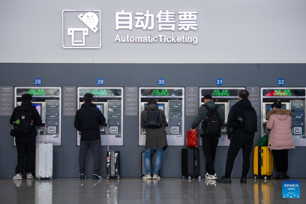 Passengers use automatic ticketing machines at Hangzhou East Railway Station in Hangzhou, east China's Zhejiang Province, Feb. 17, 2024. China witnessed an increase of passenger trips on the last day of the eight-day Spring Festival holiday. (Xinhua/Jiang Han)