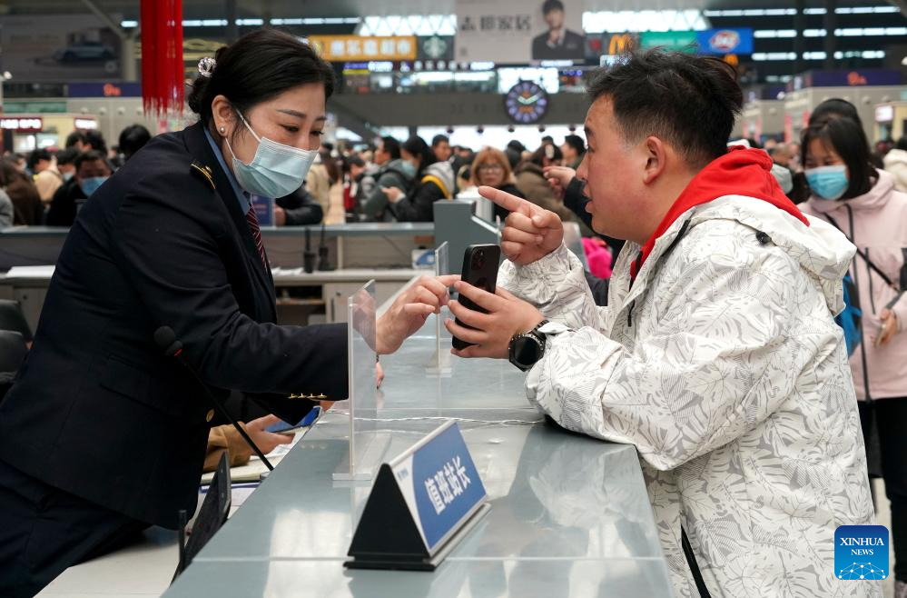 A staff member offers help to a passenger at Zhengzhou East Railway Station in Zhengzhou, central China's Henan Province, Feb. 17, 2024. China witnessed an increase of passenger trips on the last day of the eight-day Spring Festival holiday. (Photo by Su Xiaoya/Xinhua)