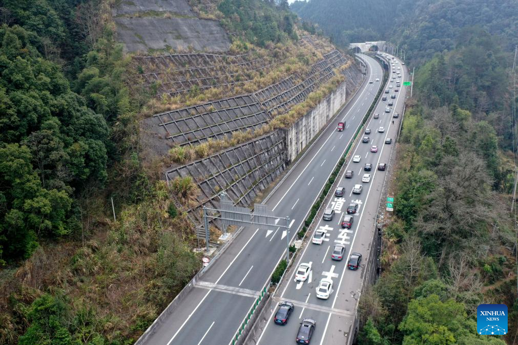 An aerial drone photo taken on Feb. 17, 2024 shows vehicles running on an expressway in Longsheng County, south China's Guangxi Zhuang Autonomous Region. China witnessed an increase of passenger trips on the last day of the eight-day Spring Festival holiday. (Photo by Pan Zhixiang/Xinhua)