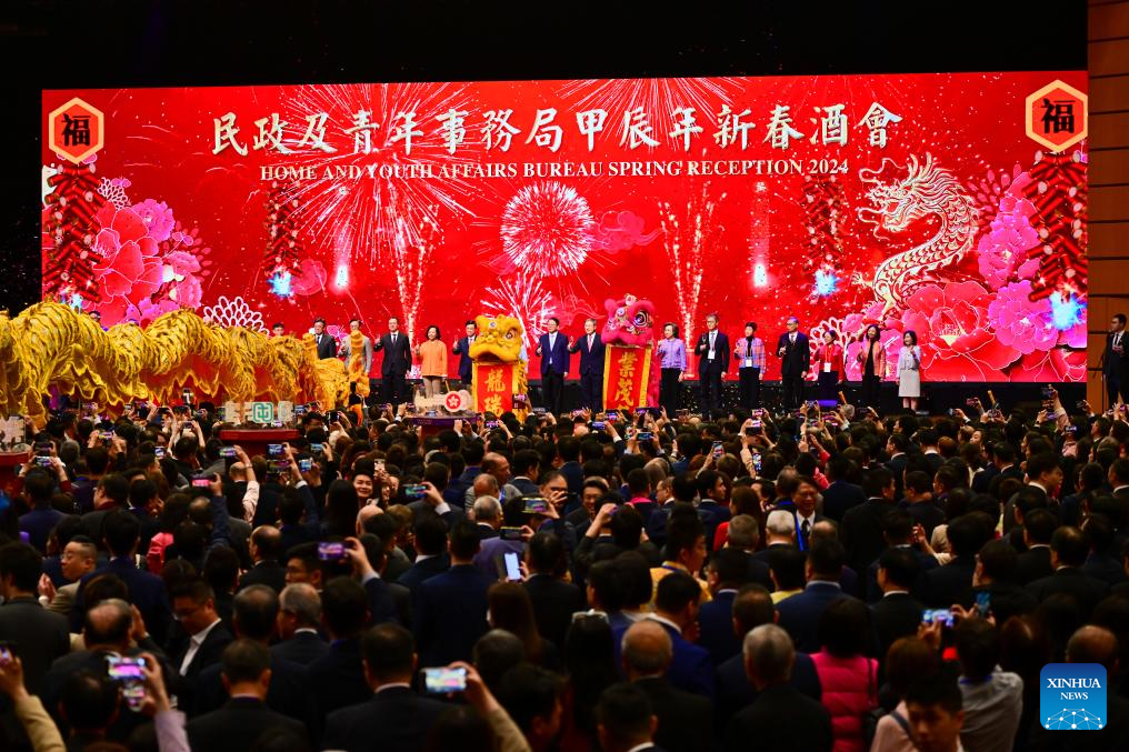 This photo taken on Feb. 16, 2024 shows a scene at the Home and Youth Affairs Bureau Spring Reception 2024 in Hong Kong, south China. (Xinhua/Zhu Wei)