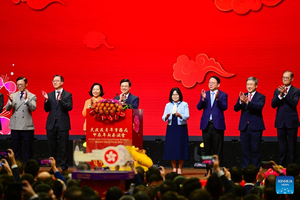 Chief Executive of the Hong Kong Special Administrative Region John Lee (4th,L) addresses the Home and Youth Affairs Bureau Spring Reception 2024 in Hong Kong, south China, Feb. 16, 2024. (Xinhua/Zhu Wei)