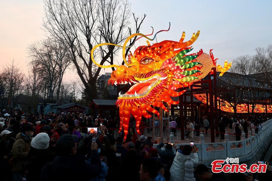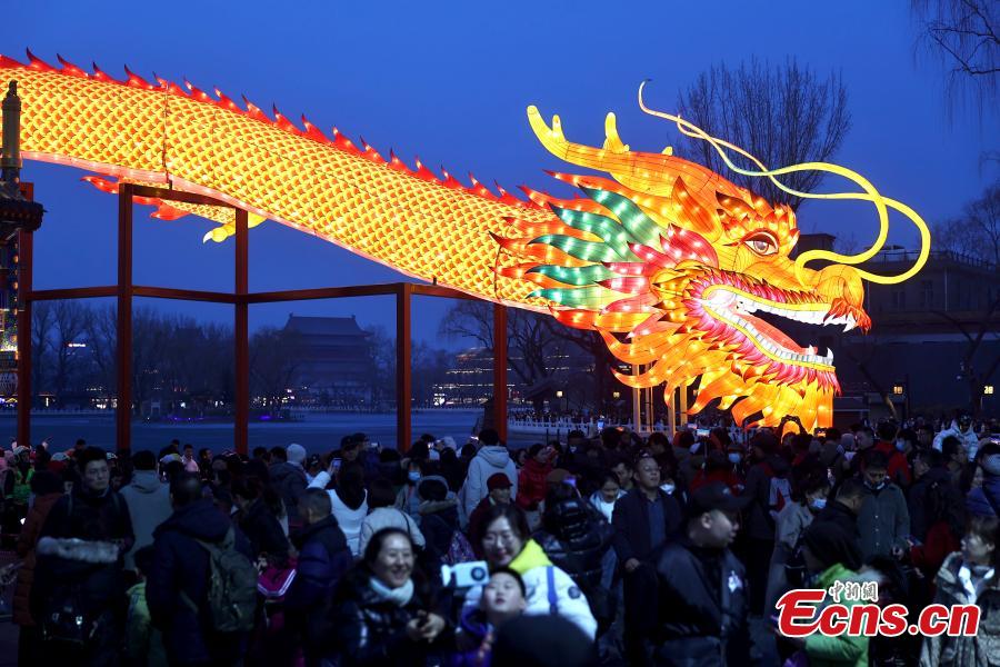 A giant Loong lantern illuminates the night sky at Shichahai scenic area to celebrate the Spring Festival in Beijing, Feb. 17, 2024. (Photo: China News Service/Yi Haifei)