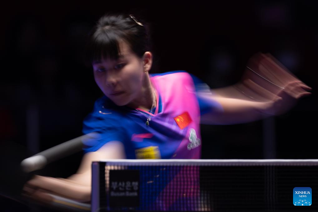Sun Yingsha of China returns the ball to Maria Xiao of Spain during the women's team Group 1 match between China and Spain at the ITTF World Team Table Tennis Championships Finals Busan 2024 in Busan, South Korea, Feb. 18, 2024. (Xinhua/Yao Qilin)