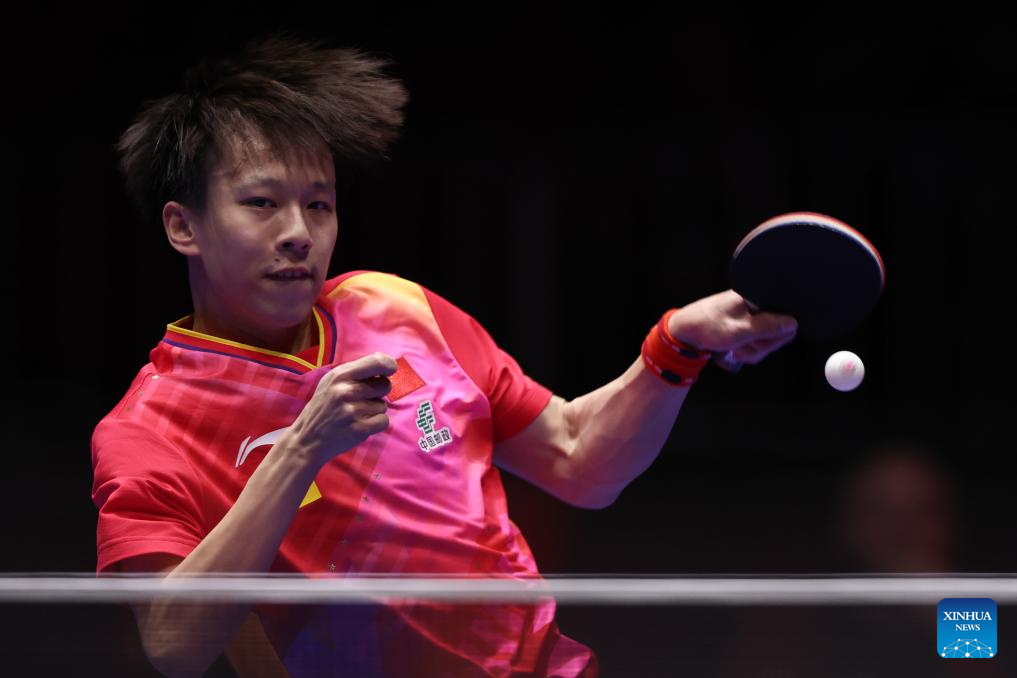 Lin Gaoyuan of China competes against Adam Szudi of Hungary during the men's team Group 1 match between China and Hungary at the ITTF World Team Table Tennis Championships Finals Busan 2024 in Busan, South Korea, Feb. 18, 2024. (Xinhua/Zhang Tao)