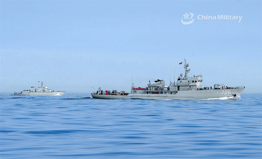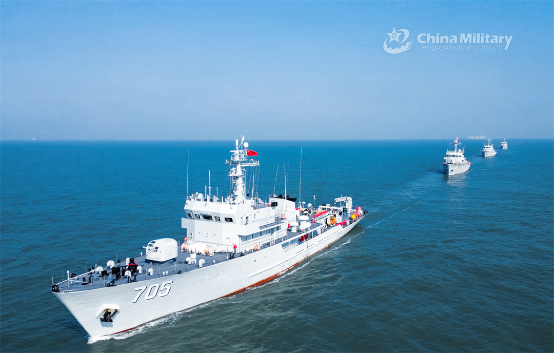 Sea mine countermeasure vessels attached to a PLA Navy group sail in formation during a minesweeping training exercise in late January, 2024. (eng.chinamil.com.cn/Photo by Wang Hu)
