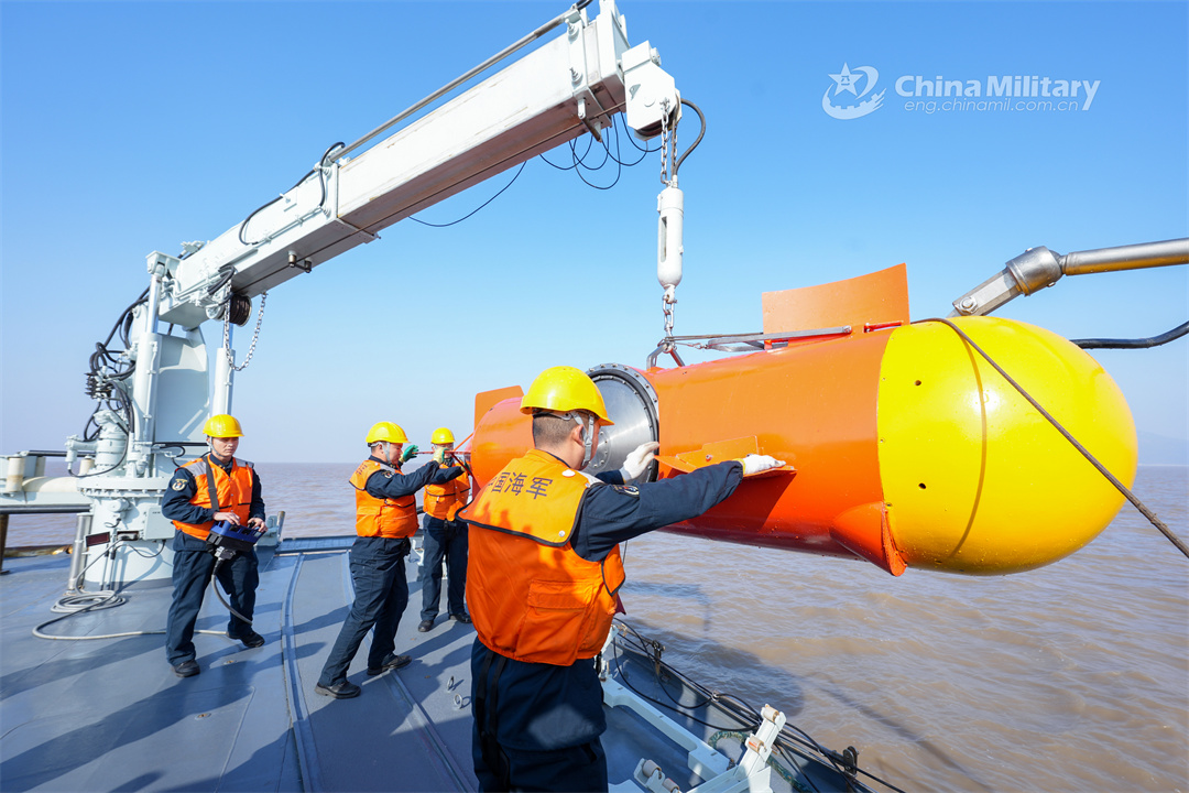 Sailors assigned to a PLA Navy group deploy an underwater mine-sweeping device into the sea during a mine countermeasures (MCM) training exercise in late January, 2024. (eng.chinamil.com.cn/Photo by Wang Hu)