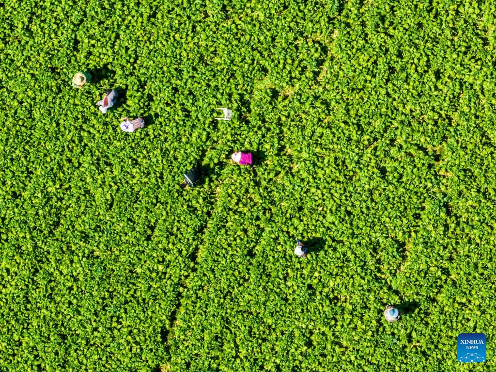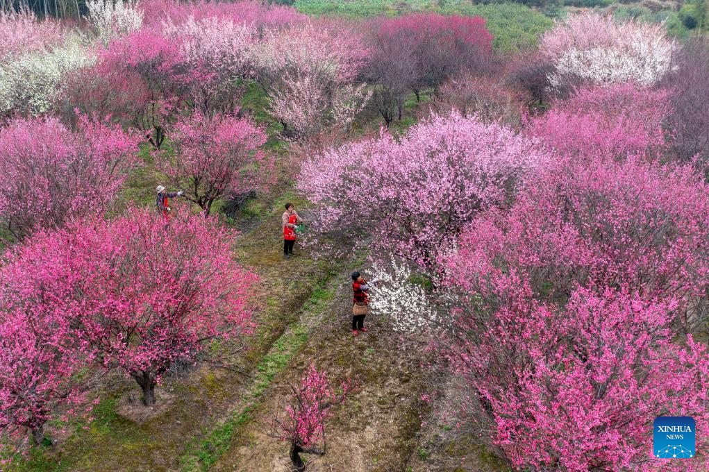 An aerial drone photo taken on Feb. 19, 2024 shows farmers picking plum flowers for perfume making at a garden in Changxing County, east China's Zhejiang Province. Farmers across China are busy with agricultural production as the day of Yushui (Rain Water), the second of the 24 solar terms in the Chinese lunar calendar, came on Monday this year. (Photo by Tan Yunfeng/Xinhua)