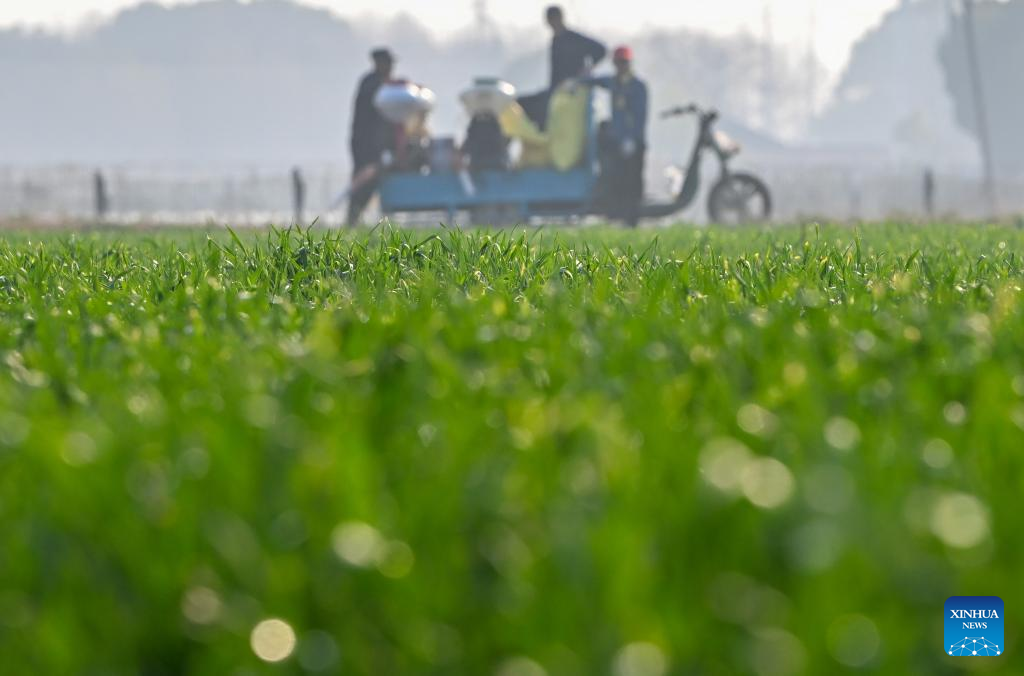 Farmers work in wheat fields in Sanlian Village, Jinxi Township, Kunshan City of east China's Jiangsu Province, Feb. 19, 2024. Farmers across China are busy with agricultural production as the day of Yushui (Rain Water), the second of the 24 solar terms in the Chinese lunar calendar, came on Monday this year. (Photo by Wang Xuzhong/Xinhua)