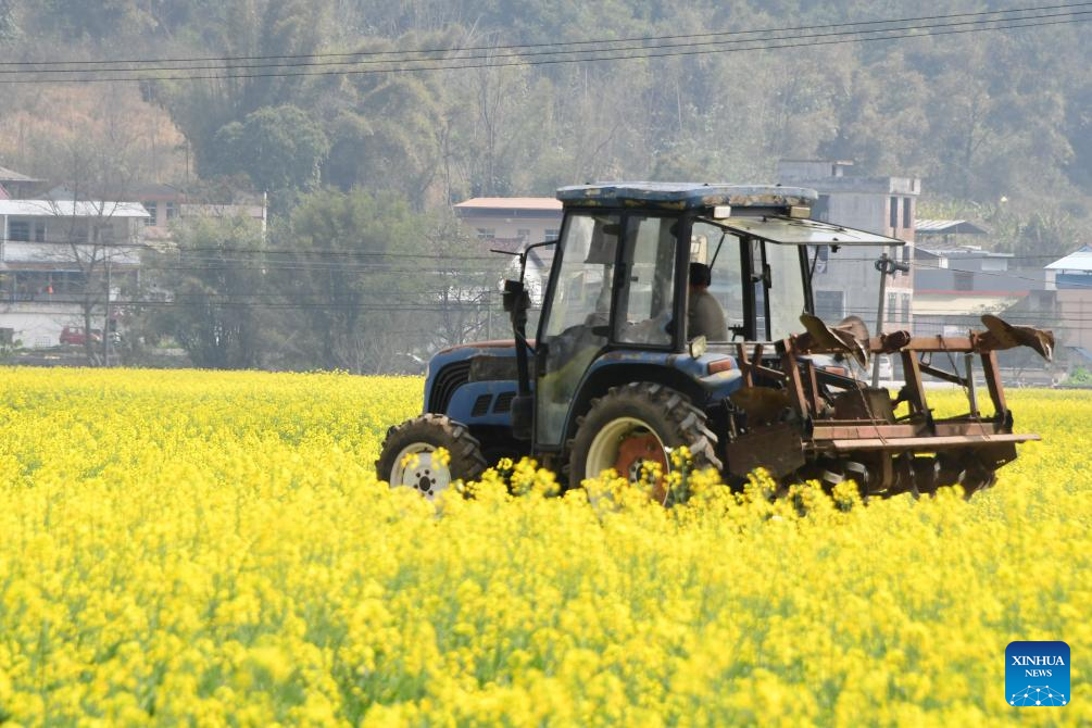 A farmer operates a machine to plough fields in Shimen Village, Siba Township, Luocheng Mulao Autonomous County, south China's Guangxi Zhuang Autonomous Region, Feb. 19, 2024. Farmers across China are busy with agricultural production as the day of Yushui (Rain Water), the second of the 24 solar terms in the Chinese lunar calendar, came on Monday this year. (Photo by Wei Rudai/Xinhua)