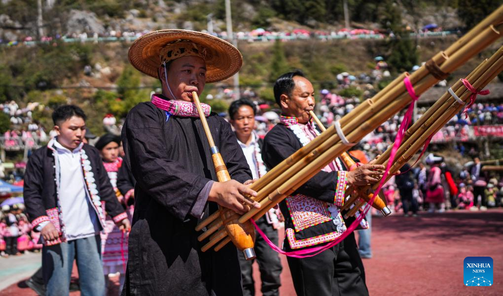 People of Miao ethnic group play lusheng, a reed-pipe wind instrument, to celebrate "Tiaohua" festival in Gaoxing Village of Liuzhi Special District, Liupanshui, southwest China's Guizhou Province, Feb. 19, 2024. People of Miao ethnic group celebrated the "Tiaohua" festival here on Monday to pray for the harvest and well-being in the new year. (Xinhua/Tao Liang)