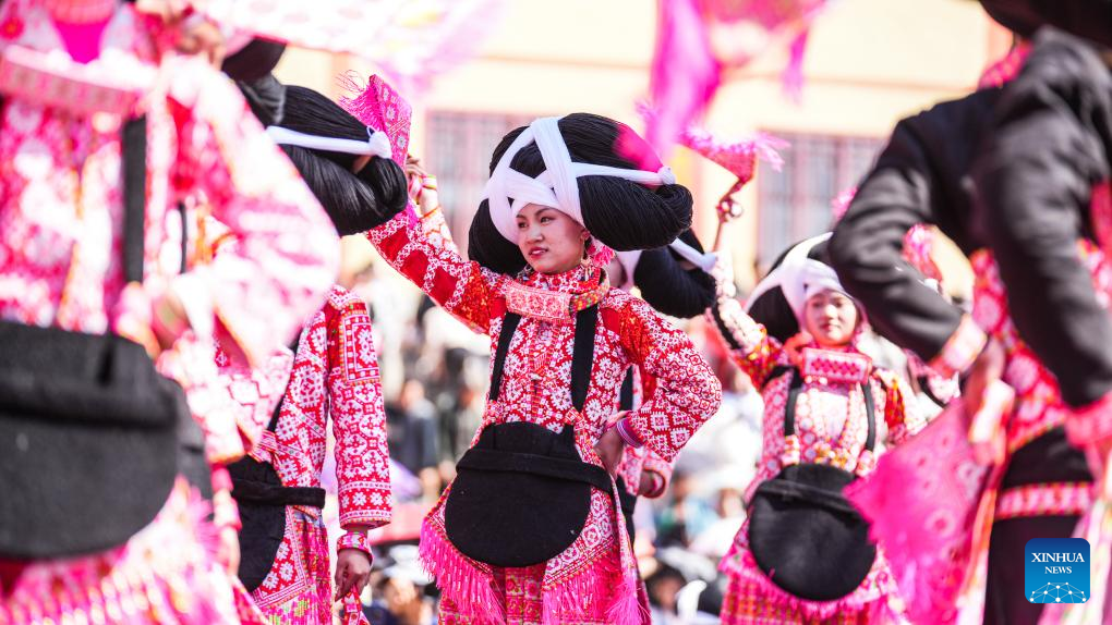 People of Miao ethnic group perform a dance to celebrate "Tiaohua" festival in Gaoxing Village of Liuzhi Special District, Liupanshui, southwest China's Guizhou Province, Feb. 19, 2024. People of Miao ethnic group celebrated the "Tiaohua" festival here on Monday to pray for the harvest and well-being in the new year. (Xinhua/Tao Liang)