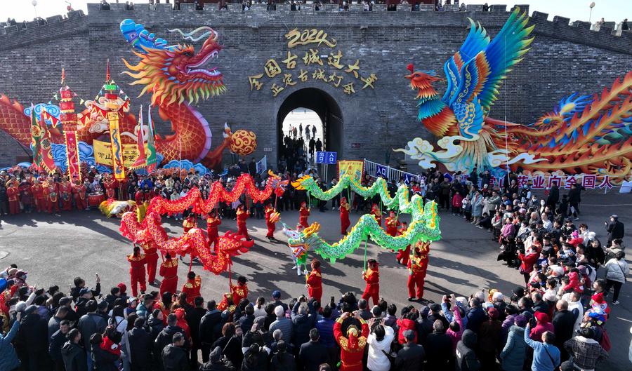 Tourists watch a dragon dance performance at the Zhengding ancient city in Shijiazhuang, north China's Hebei Province, Feb. 15, 2024. More Chinese people nowadays choose to go on a journey during the Spring Festival to experience different cultures and lunar new year atmosphere. (Photo by Chen Qibao/Xinhua)