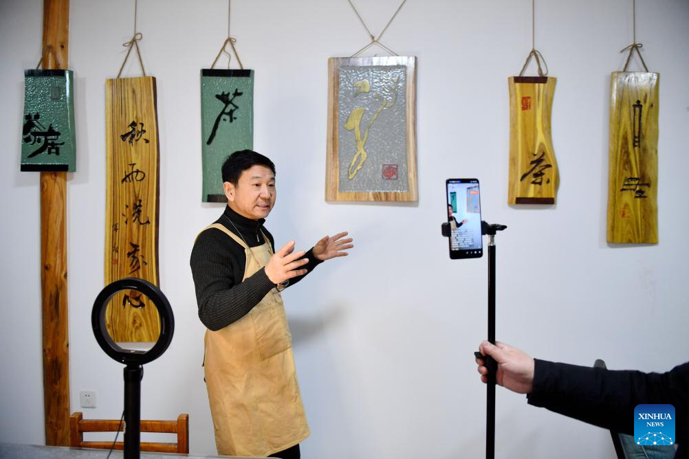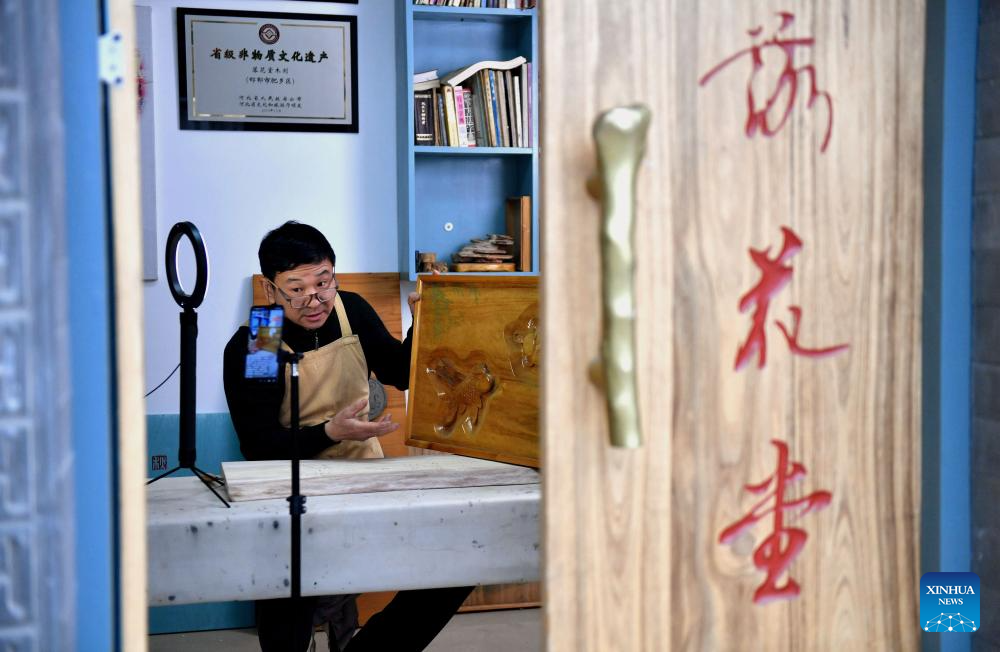 Craftsman Cui Jianjun speaks as he presents his wood carvings via live streaming in Feixiang District, Handan City, north China's Hebei Province, Feb. 19, 2024. During the Spring Festival, a series of live streaming events were held in Feixiang District of Handan, introducing the Chinese intangible cultural heritages like eggshell carving and wood carving to netizens. (Xinhua/Wang Xiao)