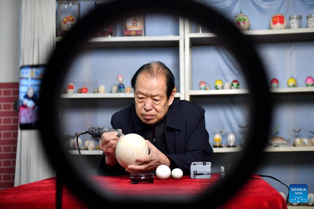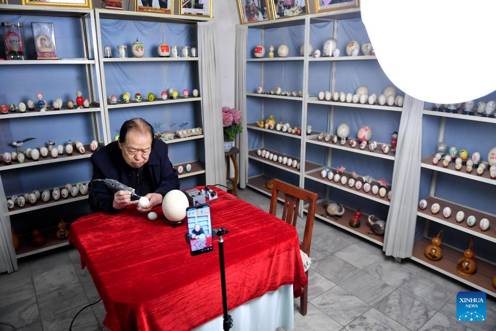 Craftsman Zheng Qingshan demonstrates eggshell carving techniques via live streaming in Feixiang District, Handan City, north China's Hebei Province, Feb. 19, 2024. During the Spring Festival, a series of live streaming events were held in Feixiang District of Handan, introducing the Chinese intangible cultural heritages like eggshell carving and wood carving to netizens. (Xinhua/Wang Xiao)