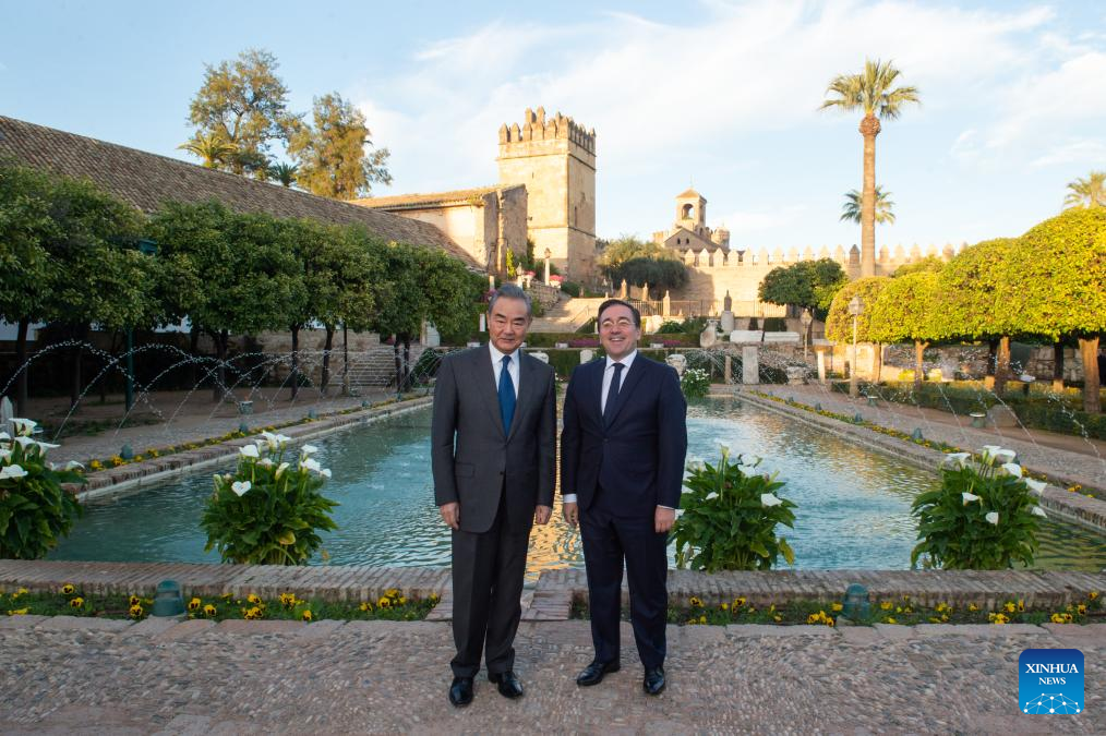 Chinese Foreign Minister Wang Yi, also a member of the Political Bureau of the Communist Party of China Central Committee, holds talks with Spanish Foreign Minister Jose Manuel Albares in Cordoba, Spain, Feb. 18, 2024. (Photo by Gustavo Valiente/Xinhua)