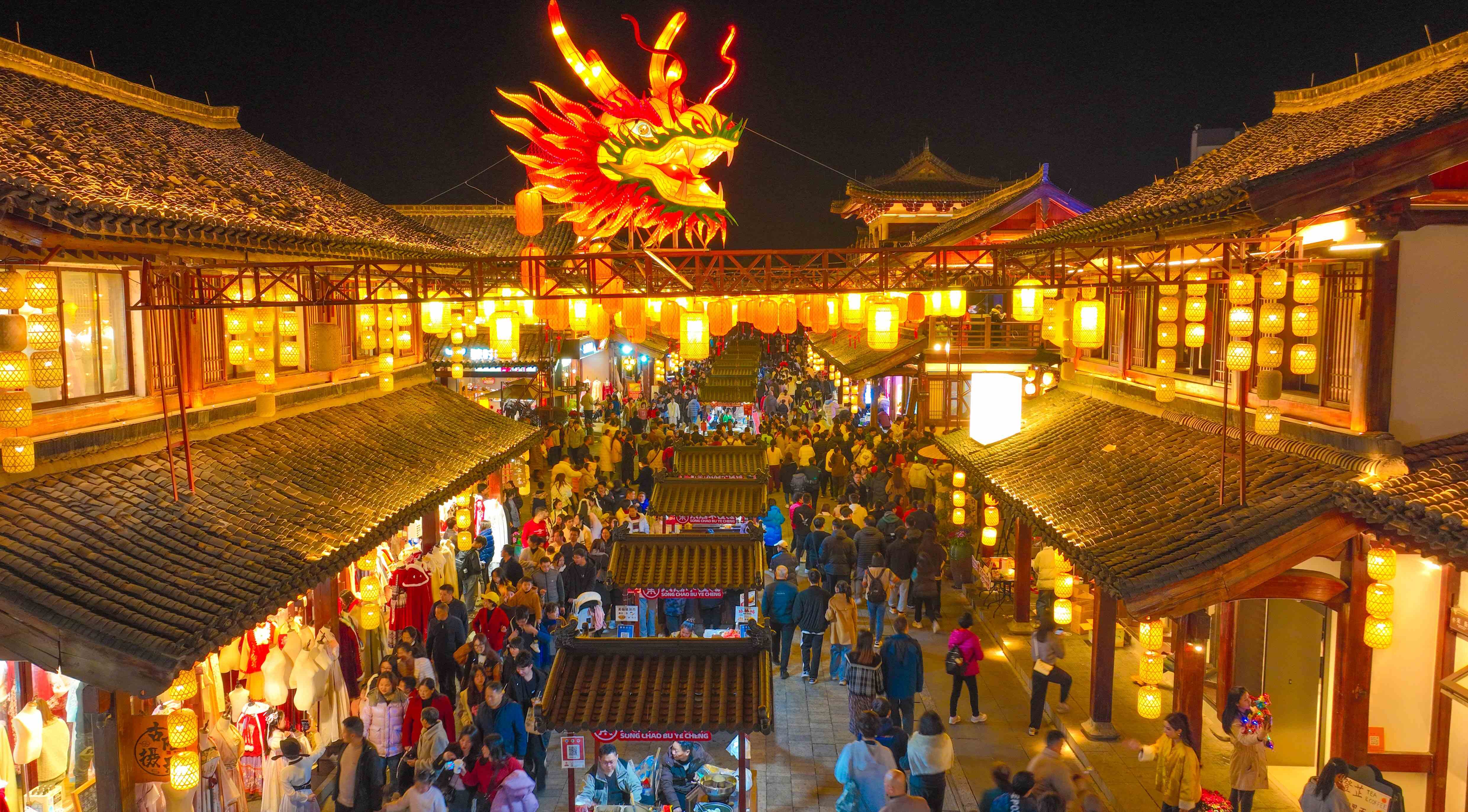 In Xi'an, northwest China's Shaanxi province, the Datang Everbright City, a tourist landmark featuring a grand street with characteristics of Tang Dynasty (618-907), shined brightly. Visitors dressed in traditional Chinese costumes, holding fans and posing for photos, and auspicious loong (the Chinese dragon) motifs could be seen everywhere.