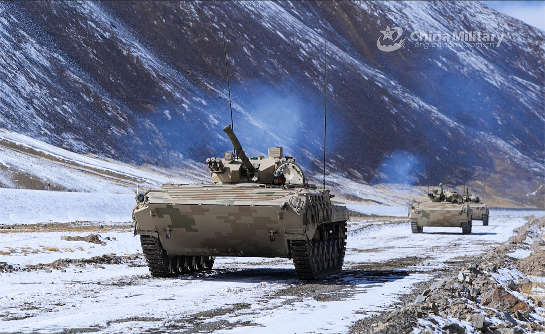 Armored vehicles attached to a regiment under the PLA Xinjiang Military Command march in formation during a maneuver training exercise on January 27, 2024. (eng.chinamil.com.cn/Photo by Liu Tao)