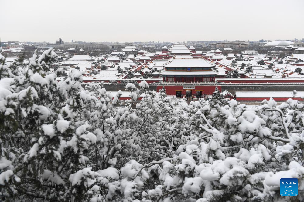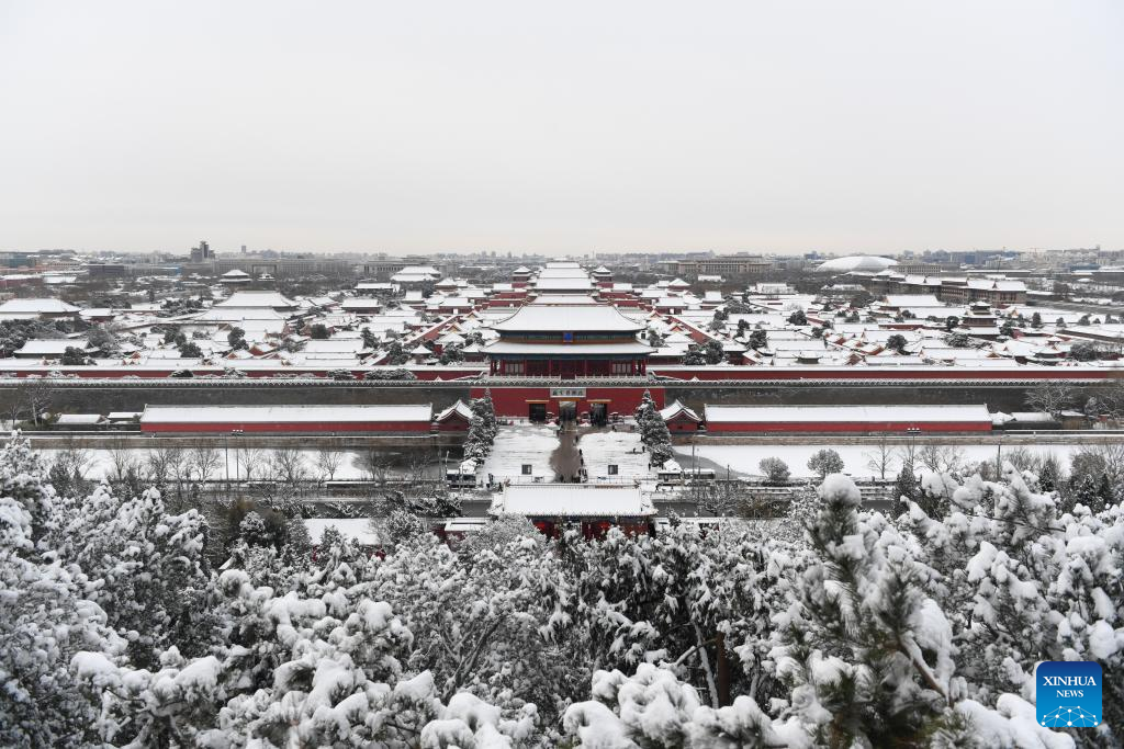 This photo taken from Jingshan Park on Feb. 21, 2024 shows the Palace Museum in Beijing, capital of China. Beijing saw a snowfall on Tuesday. (Xinhua/Ju Huanzong)