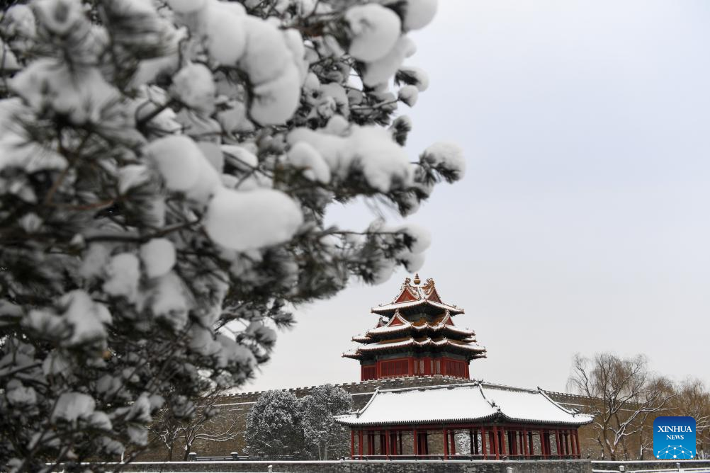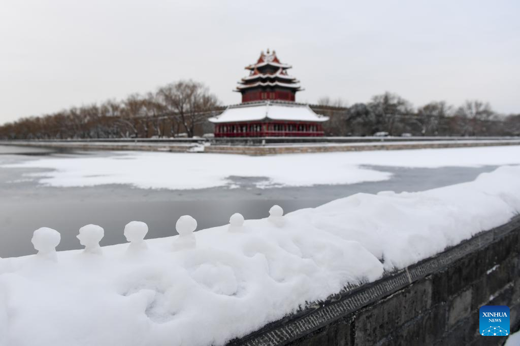 This photo taken on Feb. 21, 2024 shows a turret of the Palace Museum in Beijing, capital of China. Beijing saw a snowfall on Tuesday. (Xinhua/Ju Huanzong)