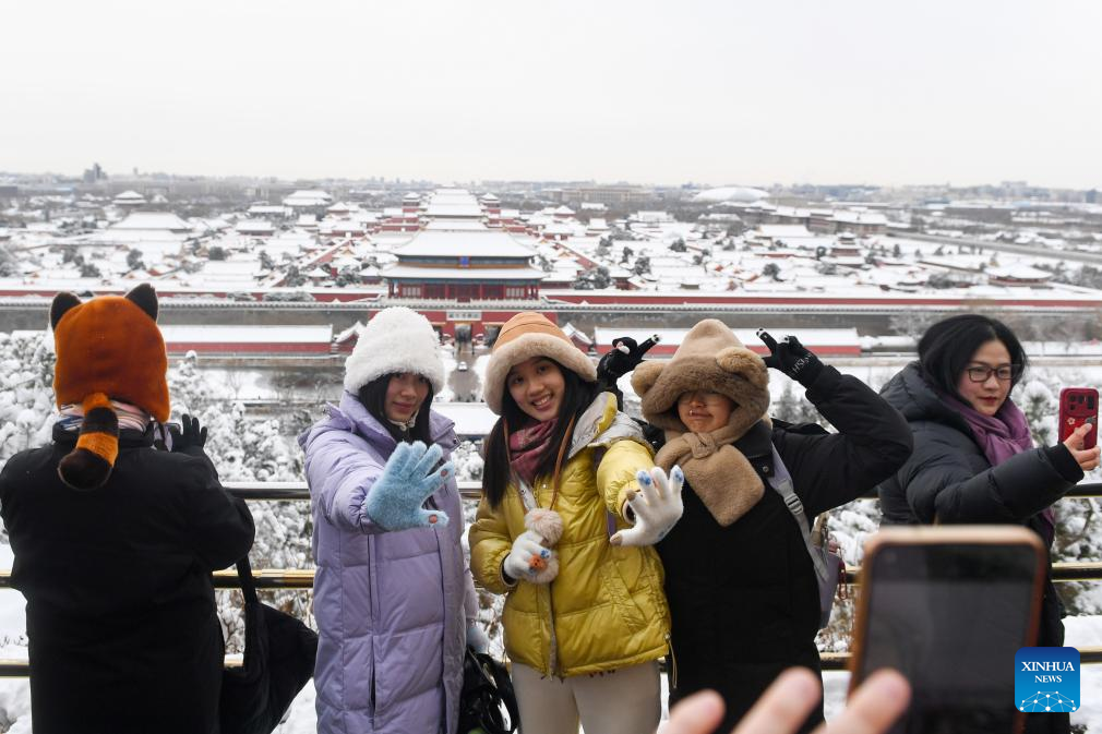 Visitors pose for photos with the Palace Museum in the background at Jingshan Park in Beijing, capital of China, Feb. 21, 2024. Beijing saw a snowfall on Tuesday. (Xinhua/Ju Huanzong)