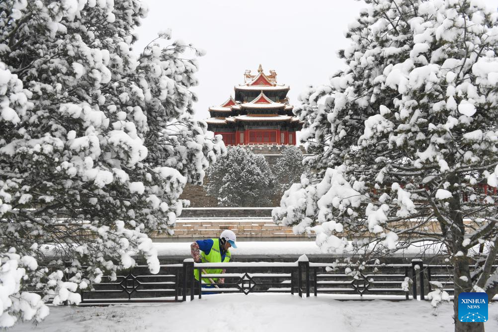 A sanitation worker removes snow near a turret of the Palace Museum in Beijing, capital of China, Feb. 21, 2024. Beijing saw a snowfall on Tuesday. (Xinhua/Ju Huanzong)