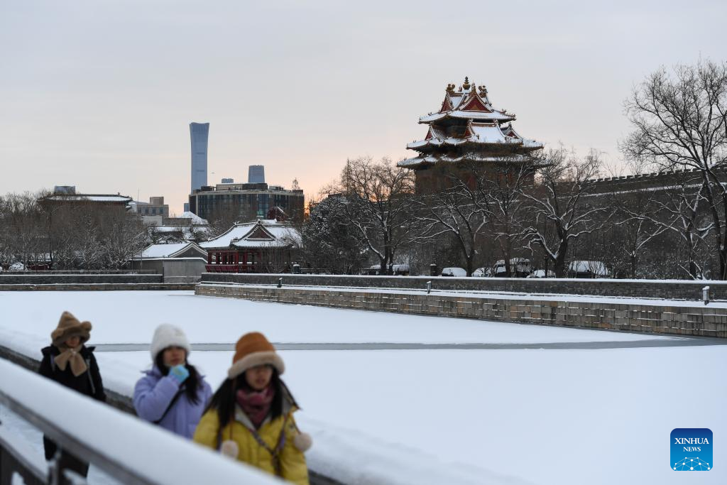 People walk near a turret of the Palace Museum in Beijing, capital of China, Feb. 21, 2024. Beijing saw a snowfall on Tuesday. (Xinhua/Ju Huanzong)